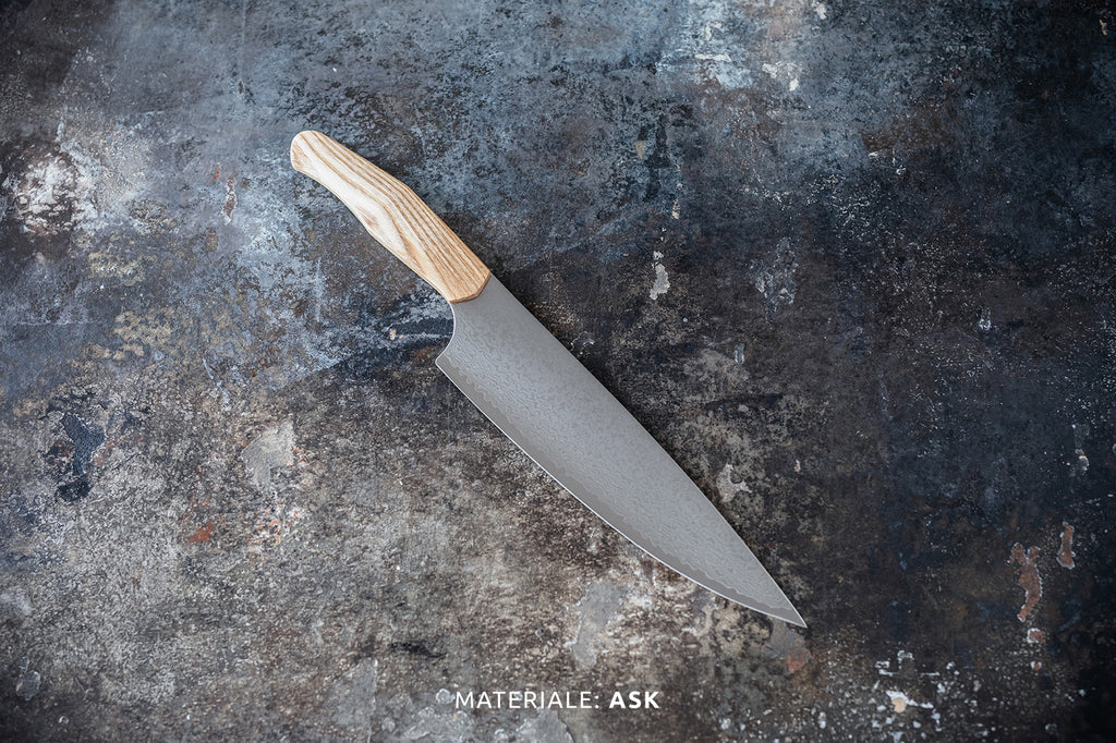 NJORD Kokkekniv er håndlavet. Nok har der været maskiner involveret til at gøre det grove arbejde i form af at slibe og skære, men kniven har under hele processen været i kyndige hænder, som har bearbejdet, finpudset og justeret for at skabe en kniv med det formål at være en fornøjelse at bruge hver eneste gang.