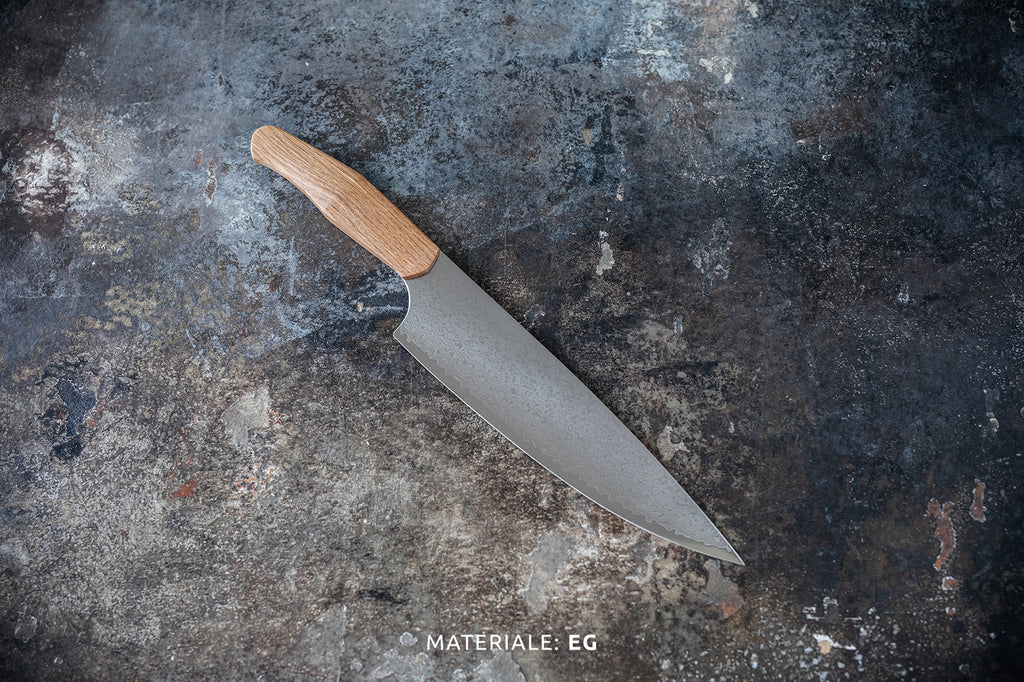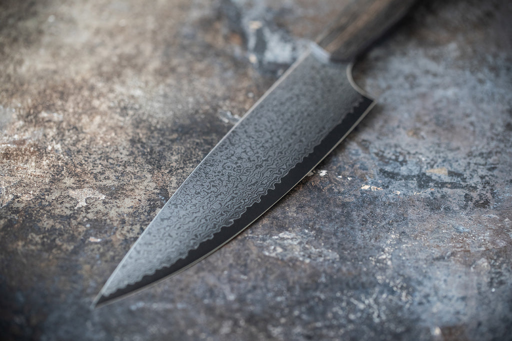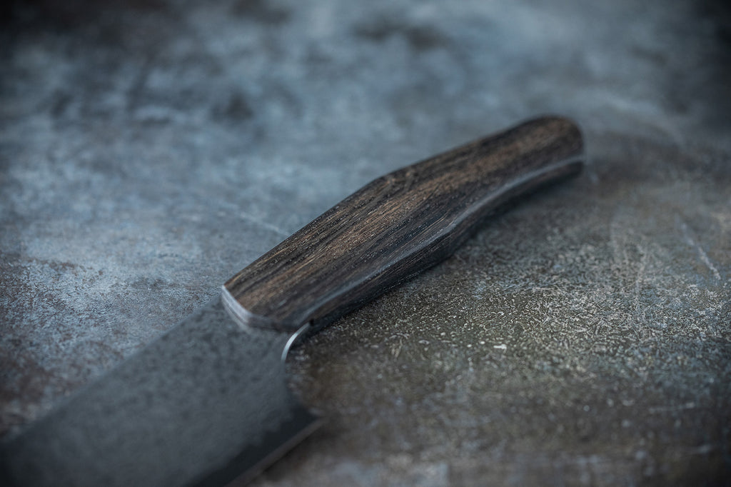 Knivklingen er smedet i Japan efter gamle traditionelle håndværksmetoder. Den er smedet af 33 lags VG10 San Mai-stål, hvilket giver det unikke mønster.