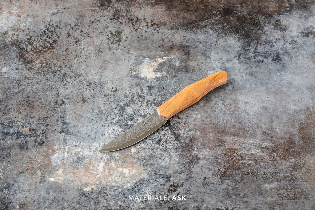Det ergonomiske skæfte er udformet i ask, lys eg eller moseeg. Både ask og eg er slidstærke og hårde træsorter, der tåler års intensivt slid, og som blot får en smukkere patinering med tiden. Træet gennemgår en særlig imprægneringsmetode, der sikrer, at det forbliver smukt og stabilt. Bemærk, at skæfterne kan variere i udseende, eftersom vi anvender naturmaterialer.