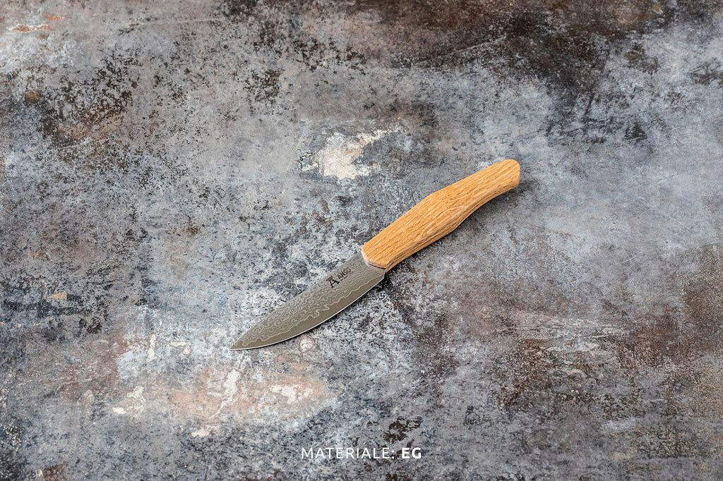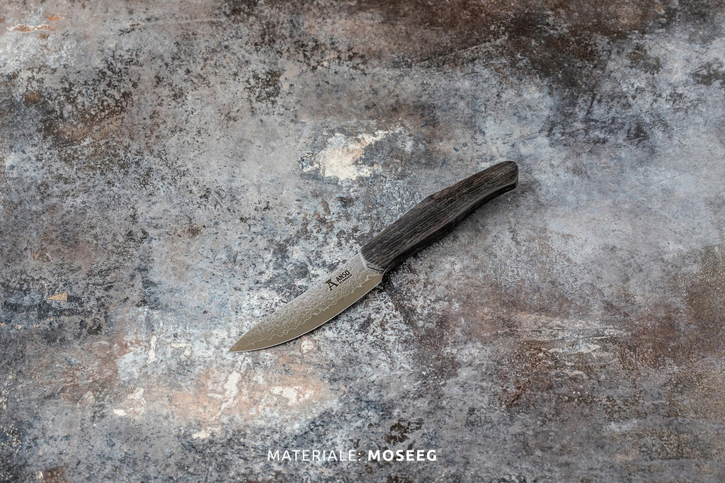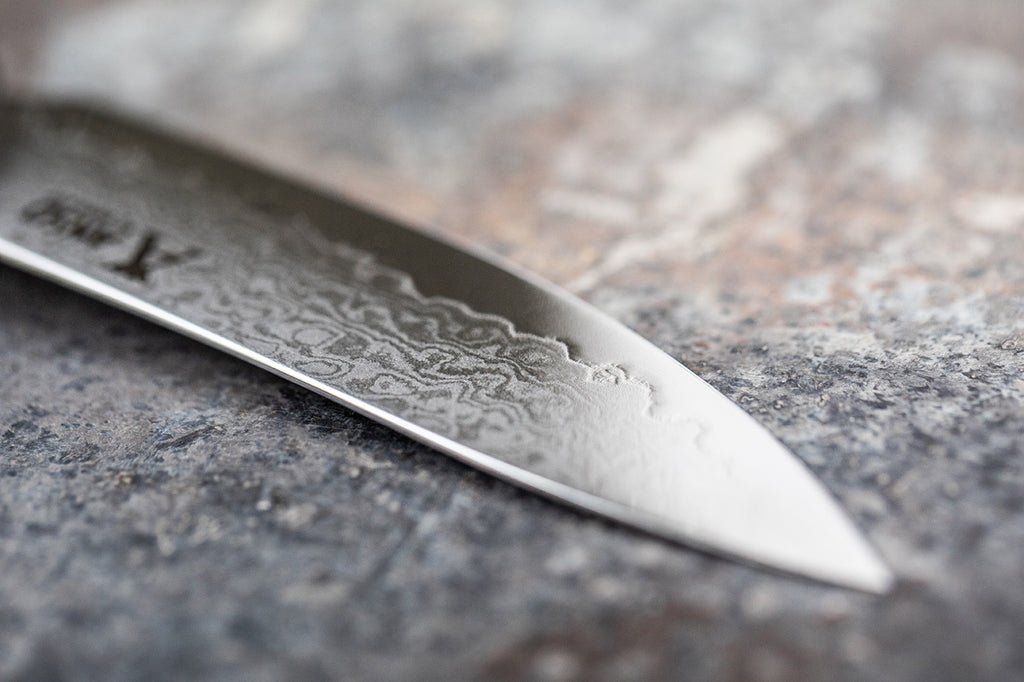 Knivklingen er smedet i Japan efter gamle traditionelle håndværksmetoder. Den er smedet af 33 lags VG10 San Mai-stål, hvilket giver det unikke mønster.